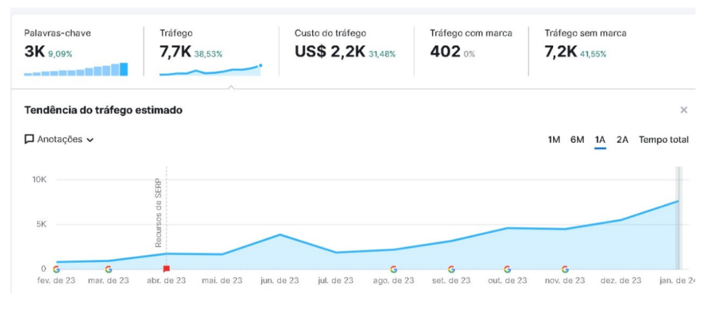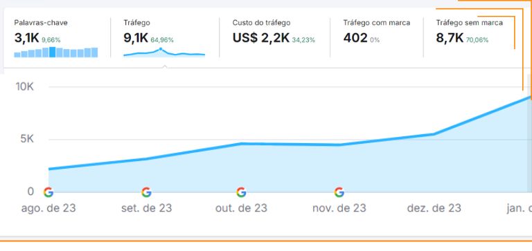 Em fevereiro de 2023 quando começamos a trabalhar no site da BR24 tínhamos um total de 610  palavras indexadas e um tráfego de 818 acessos. Em janeiro de 2024 a projeção do Semrush aponta para um tráfego de 7.872 acessos com 2800 palavras indexadas.